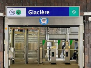 | Cette station a été ouverte le 24 avril 1906 et son nom vient de sa proximité avec la rue de la Glacière qui était un ancien chemin passant par le hameau de la Glacière, village alors traversé par la Bièvre dont les nombreuses mares et étangs gelaient l’hiver. Leur glace était récupérée puis entreposée dans des cavités souterraines. Elle était ensuite vendue par des crieurs et fournissait toute l’année de la fraîcheur aux Parisiens. |