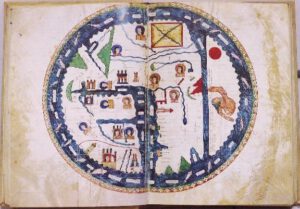 Les cartes dites en « T dans l’O » divisent la Terre en trois continents de façon symbolique. En s’appuyant sur la lecture de la Bible, le christianisme imposa une représentation religieuse du monde. Sur cette carte rédigée par le moine espagnol Beatus de Liebana vers 885 figure une quatrième partie en direction du sud légendée « Terre Australe ». |