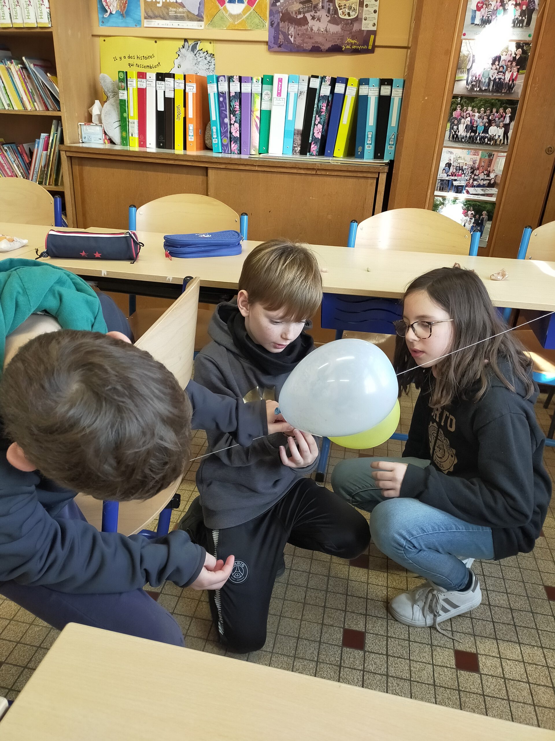 - une expérience scientifique en groupe. Les enfants manipulent des objets pour amener à une démarche scientifique. Par exemple, avec les marraines d’ArianeGroup à Hardricourt, avec un ballon de baudruche, une paille et une ficelle, nous les avons fait réfléchir sur les critères qui font qu’un ballon gonflé monte plus ou moins loin le long d’un fil ;