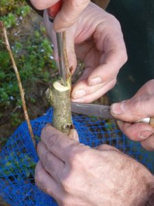 L’Opinel a ensuite été planté dans son cœur, pour inciser le tronc, sans le couper en deux bien sûr ! Observez bien la petite branchette sur le côté… C’est le tire sève, elle est très importante, car elle aidera la greffe à prendre.