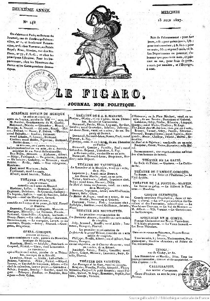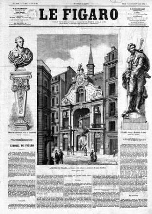 Voici quelques points de repère : fondé en janvier 1826 sous Charles X (la première parution date du 15 janvier), Le Figaro est à ses débuts une feuille humoristique, satirique, comme d’autres à l’époque (Le Corsaire, Le Diable boiteux, Le Satan). Ces journaux s’insurgent ainsi contre une prétendue liberté de la presse, d’où le nom de Figaro, emprunté au jeune valet qui dans une tirade dans Le Mariage de Figaro, plaide en faveur de la liberté de la presse : « […] Je lui dirais… que les sottises imprimées n’ont d’importance qu’aux lieux où l’on en gêne le cours ; que, sans la liberté de blâmer, il n’est point d’éloge flatteur et qu’il n’y a que les petits hommes qui redoutent les petits écrits. »