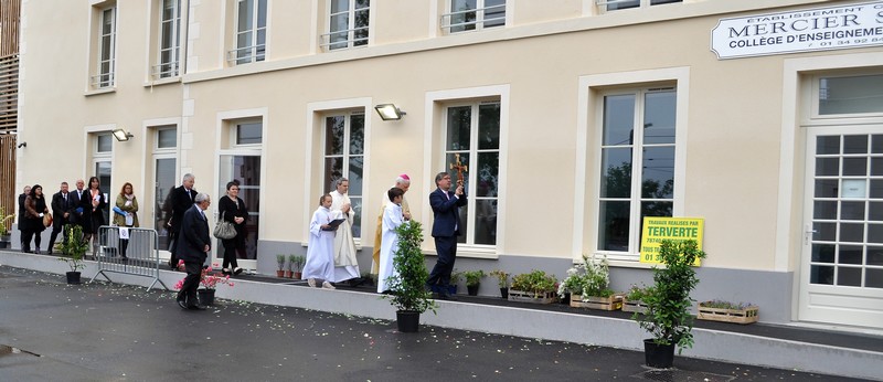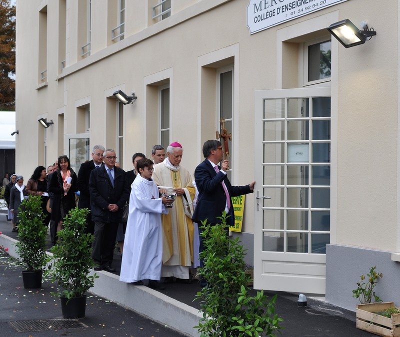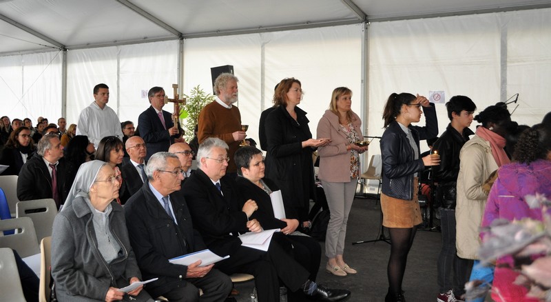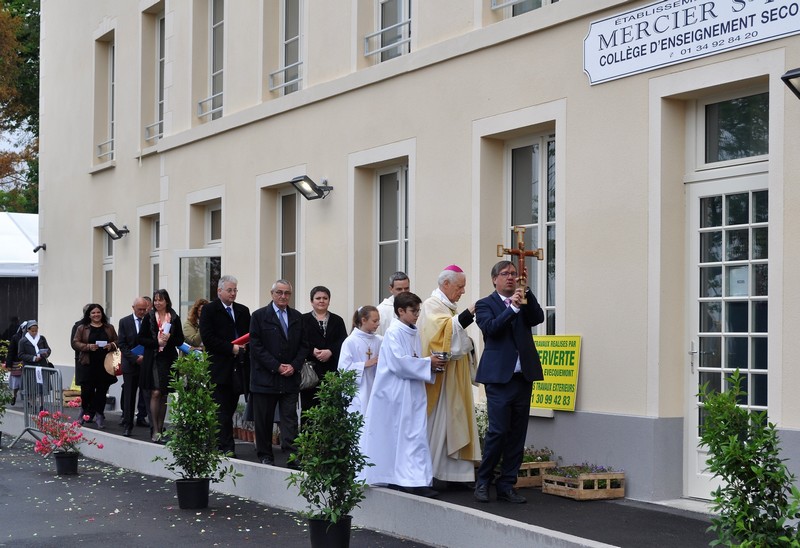 C’est sous une grande tente dressée près du tout nouvel établissement Mercier Saint-Paul, que les invités avaient pris place en ce jour tant attendu, celui de l’inauguration du collège, ouvert depuis maintenant plus de quatre mois. Avant que la messe de bénédiction ne commence, Bruno Ropartz, directeur de l’établissement, a d’abord remercié et souhaité la bienvenue à notre évêque, Monseigneur Eric Aumonier, Cécile Zammit-Popescu, maire de Meulan, Emmanuel Vandroux, directeur diocésain de l’Enseignement catholique, Sœur Monique-Françoise, supérieure des sœurs de Saint-Paul de Chartres, Hervé Girard, président du Comité Local de l’Enseignement (CLEM) et bien sûr, tous les enseignants et les employés du collège. En soulignant l’implication de tous, ce qui a permis un déménagement rapide, il a insisté sur le calme et le silence que les élèves et les enseignants ont pu trouver en ce nouveau lieu, deux choses très propices à « l’accession à l’intériorité qui permet l’éveil spirituel et l’écoute de la parole de Dieu » ! Il a terminé son discours en remerciant à nouveau notre évêque qui « aide à accueillir celui qui bâtit cette maison : le Christ ! ».