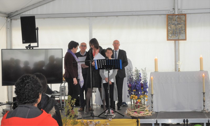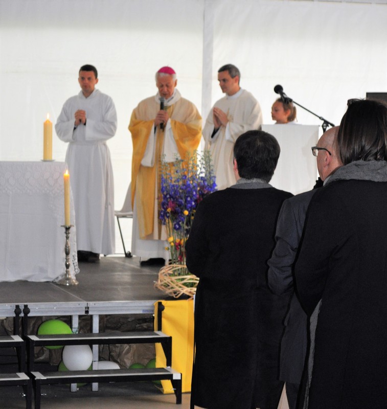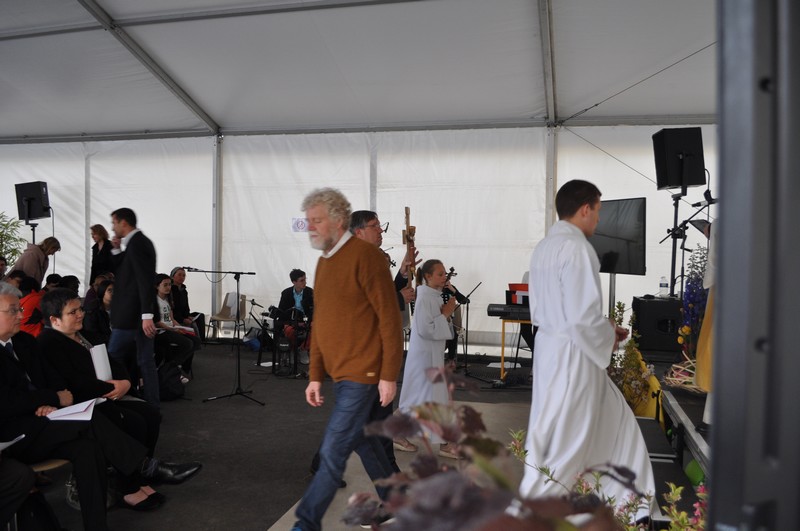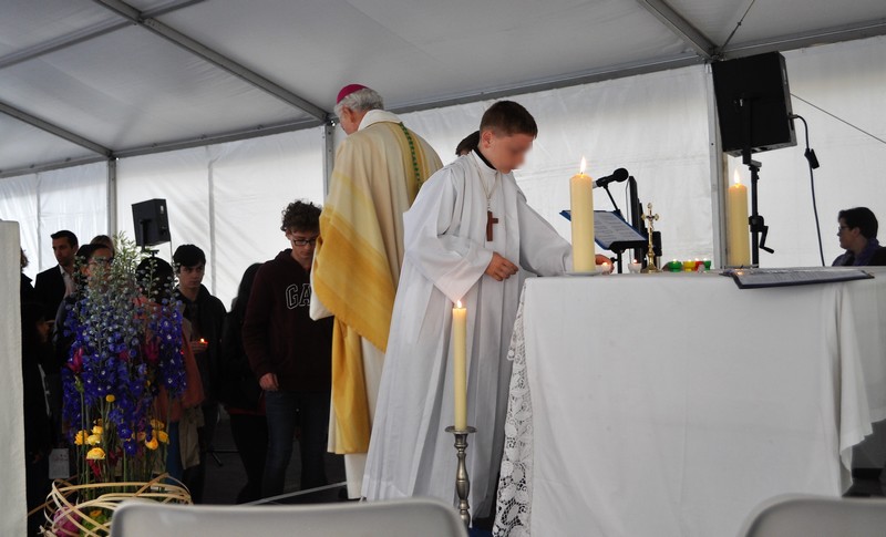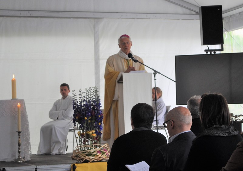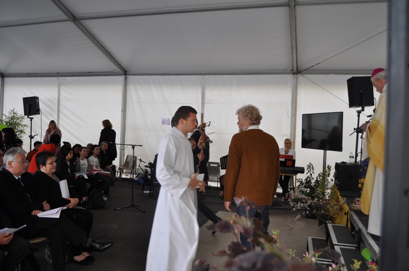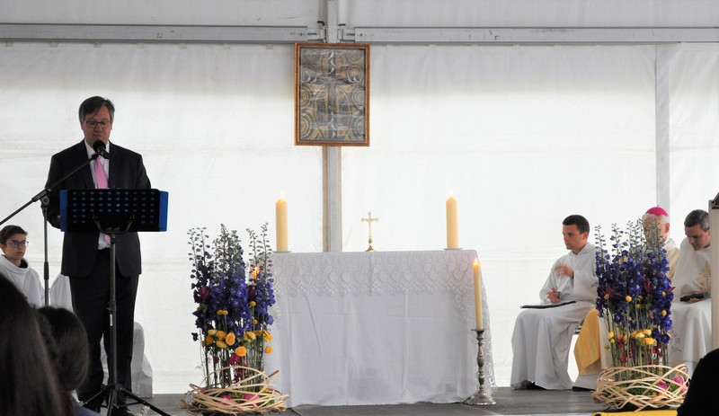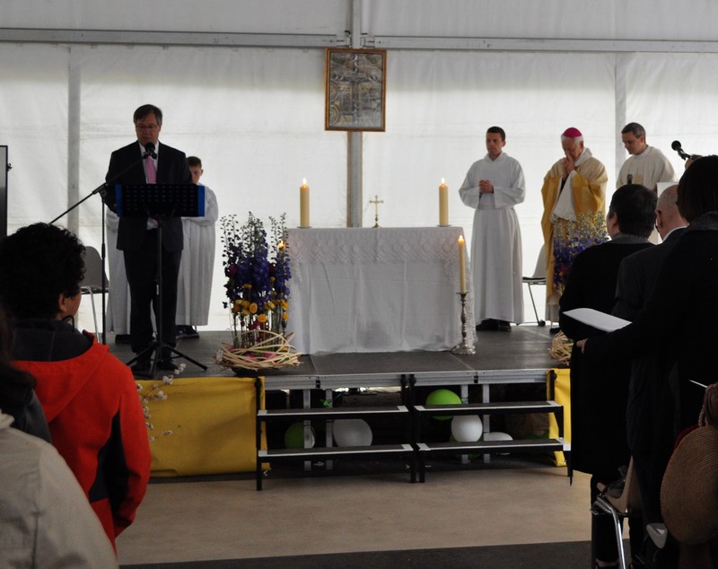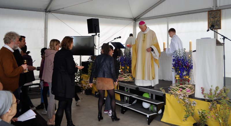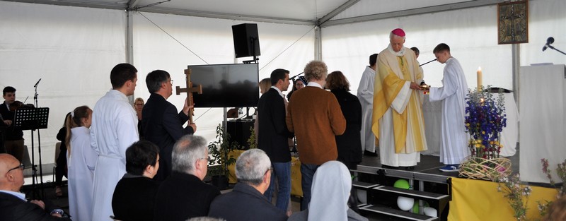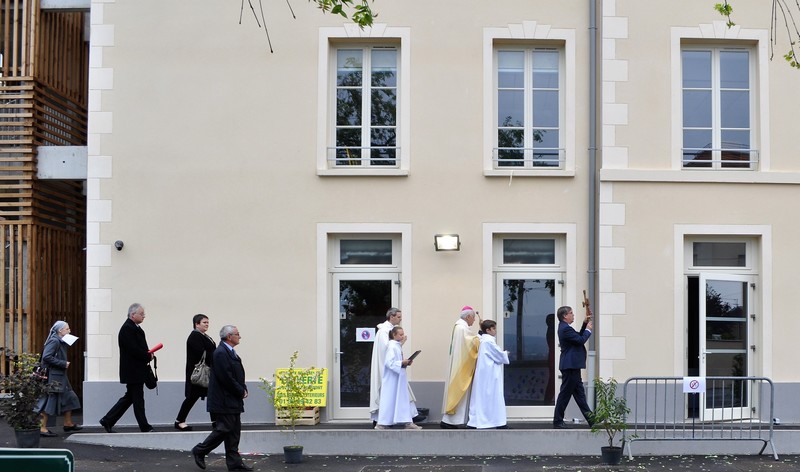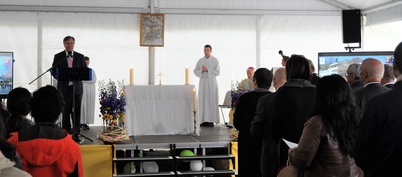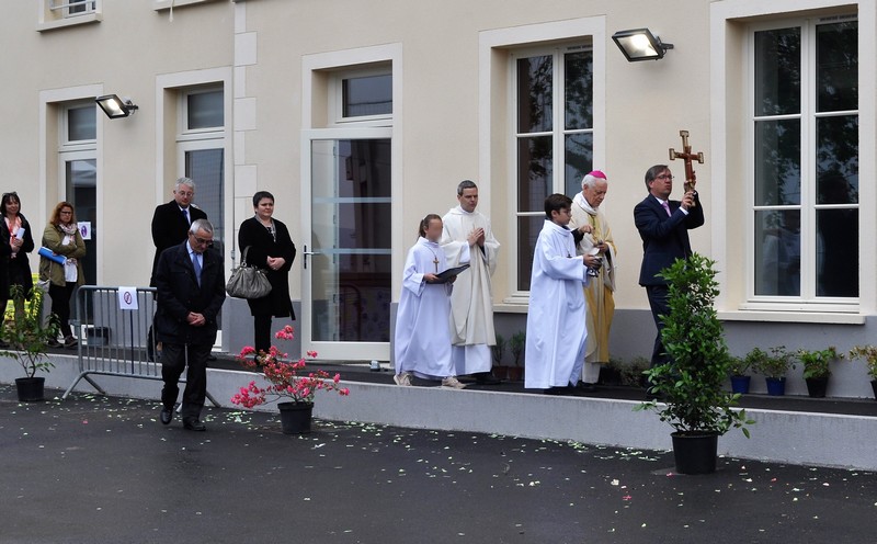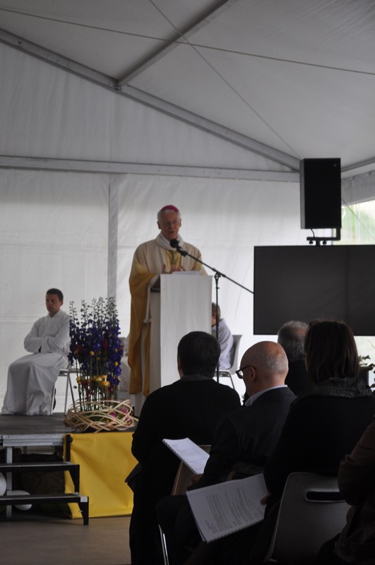 Pendant la messe qui a suivi, dans son homélie, Eric Aumonier a d’abord fait plusieurs métaphores relatives à la construction, celle du bâtiment bien sûr puisqu’il s’agissait d’inaugurer une nouvelle école, mais aussi celle des hommes et des femmes que seront bientôt les élèves du collège. Il a parlé de fondations, celles solides sur lesquelles on peut bâtir quelque chose de durable et a comparé notre corps à « un tabernacle accueillant Jésus…», une image très forte !