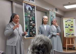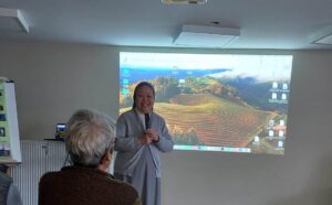 Les diaporamas nous ont instruit sur l’histoire du début de la fondation initiée par le Père Louis Chauvet en France en 1696 à Levesville-la-Chenard dans la Beauce, puis son évolution dans le monde entier jusqu’à maintenant en 2026. Actuellement les congrégations se répartissent dans le monde en 15 provinces accueillant au minimum 50 sœurs du pays, puis 8 districts et 2 régions. Au total avec les postulantes nous pouvons compter 4260 sœurs dans 39 pays sur les 5 continents. En 2021 les provinces fêtaient leur jubilé, anniversaire des 325 ans et chacune s’est organisée pour planter un arbre. Leur vocation principale s’oriente vers trois axes : l’éducation, la santé, et la pastorale.
