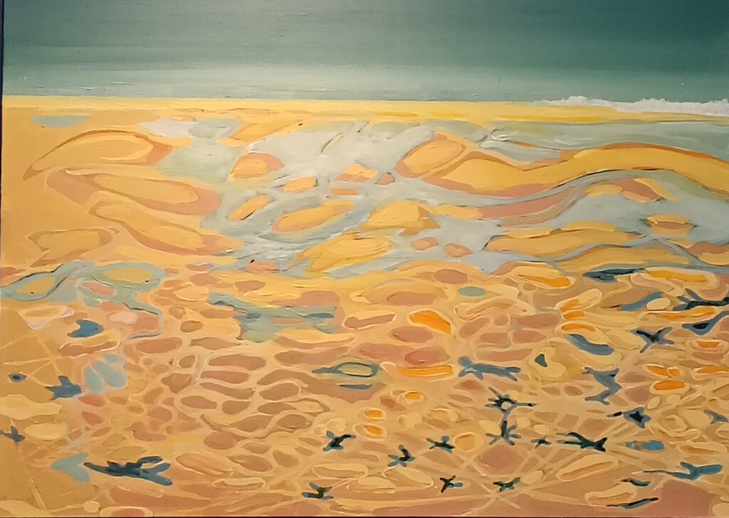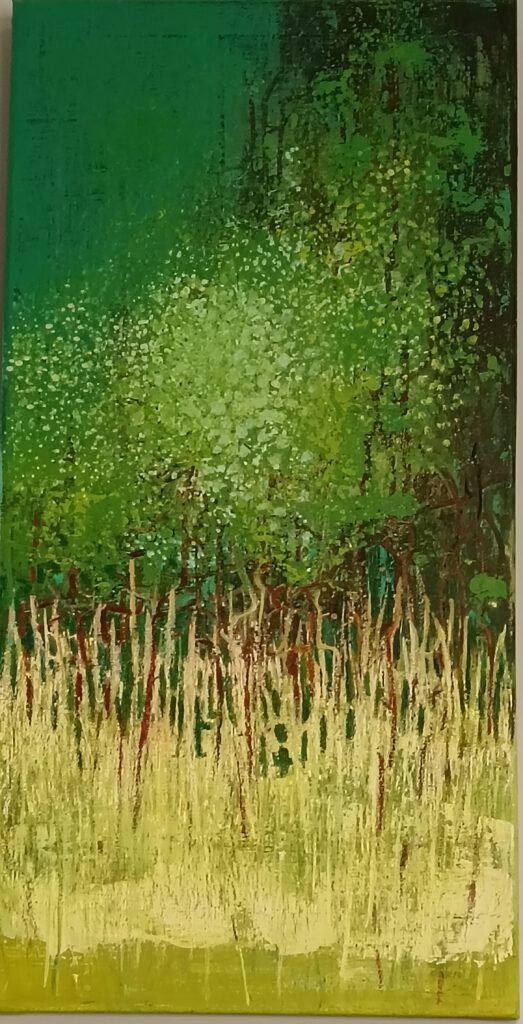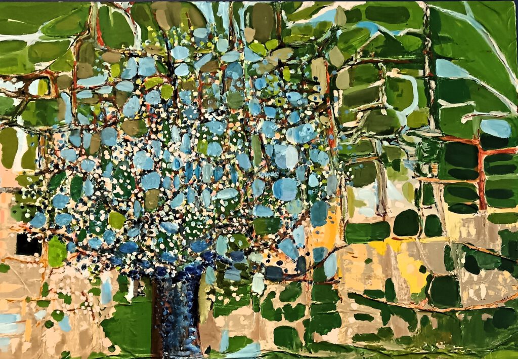 A mi-chemin entre la peinture figurative et l’art abstrait, cette artiste, qui se qualifie elle-même de peintre « d’instinct », a proposé une quinzaine de toiles très variées. Ses tableaux, qu’elle peint de mémoire après un flash au cours d’une promenade ou après un évènement vécu, sont le travail d’une artiste accomplie. Il est vrai que Valérie Aguer a bénéficié d’une formation technique de premier ordre, formation acquise à l’Ecole Nationale des Arts Décoratifs de Paris, établissement dont elle a suivi les cours. Après quelques années pendant lesquelles elle a préféré donner la priorité à sa famille, elle a enseigné les arts plastiques en collège et en lycée tout en donnant des cours privés dans des ateliers municipaux à Marly-le-Roi, Versailles et Noisy-le-Roi. Ce n’est qu’en 2005 qu’elle a repris les pinceaux pour se consacrer à la création. Elle ne participe que très rarement à des expositions, c’est donc une grande chance pour les Meulanais de pouvoir contempler ses toiles qui, le plus souvent, garnissent les murs de sa demeure. Et ce n’est qu’au cours d’expositions collectives appelées Chemin des arts qu’elle ouvre ses portes aux visiteurs.